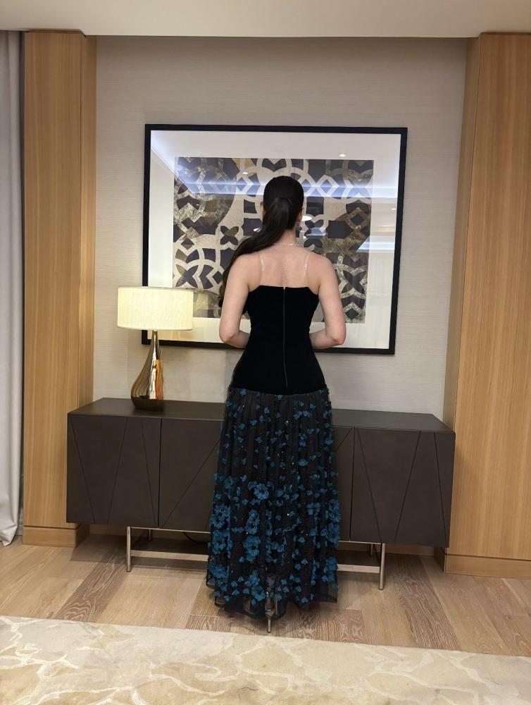 فستان أسود مزين بالورد الأزرق
